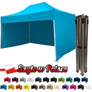 Stelaż wykonany jest z stali malowanej proszkowo, wraz z stalowymi łącznikami i zgrzewaną dużą stopą. Do wyboru mamy ponad 20 kolorów – namiot może być wielokolorowy bez zmiany ceny.